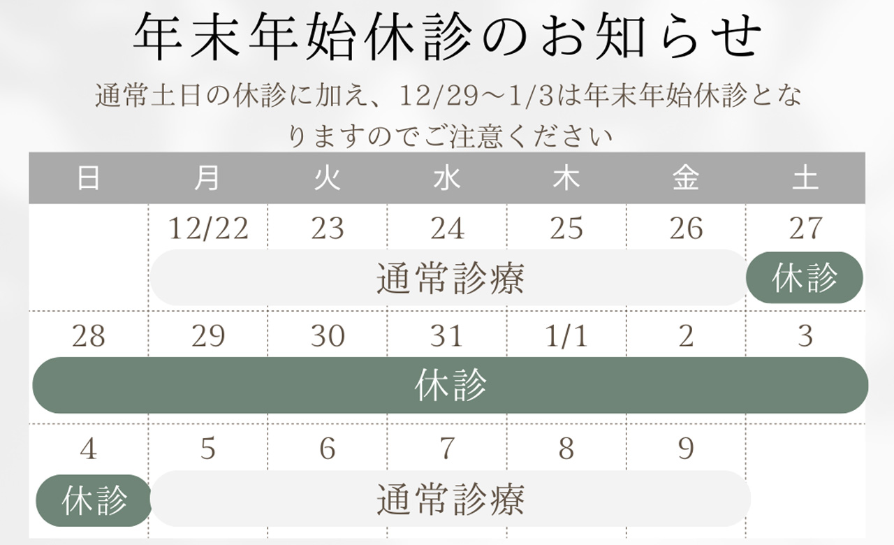 今年度は土日の休診も含めて、12月27日(土)から1月4日(日)